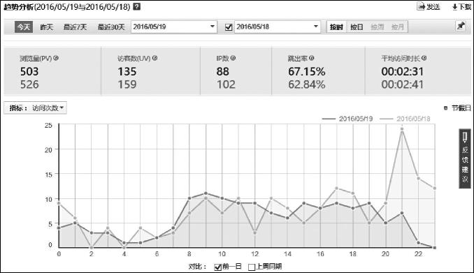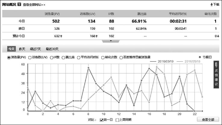 1.環(huán)比選中折線圖下方的“前一日”復(fù)選框,圖中顯示的是今天與昨天每小時(shí)瀏覽量對(duì)比。