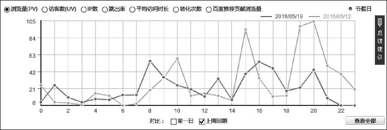 2.同比選中折線圖下方的“上周同期”復(fù)選框,圖中顯示的是今天每小時(shí)數(shù)據(jù)與上周同一天的每小時(shí)瀏覽量對(duì)比,