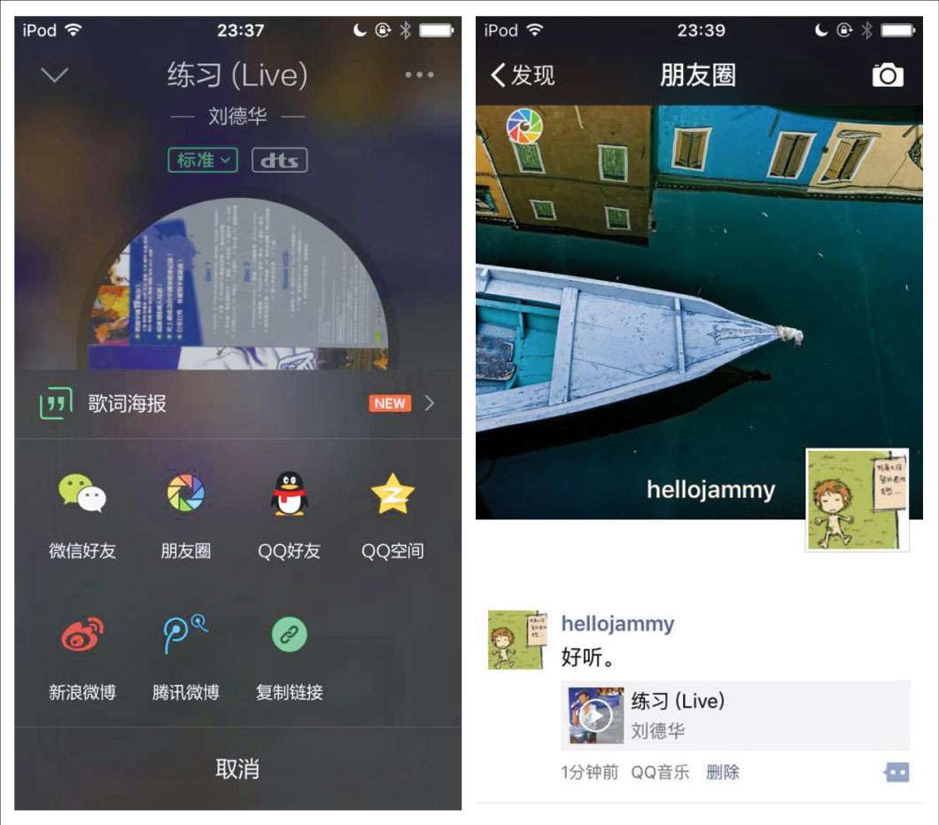 圖1-6 QQ音樂分享至朋友圈和微信好友